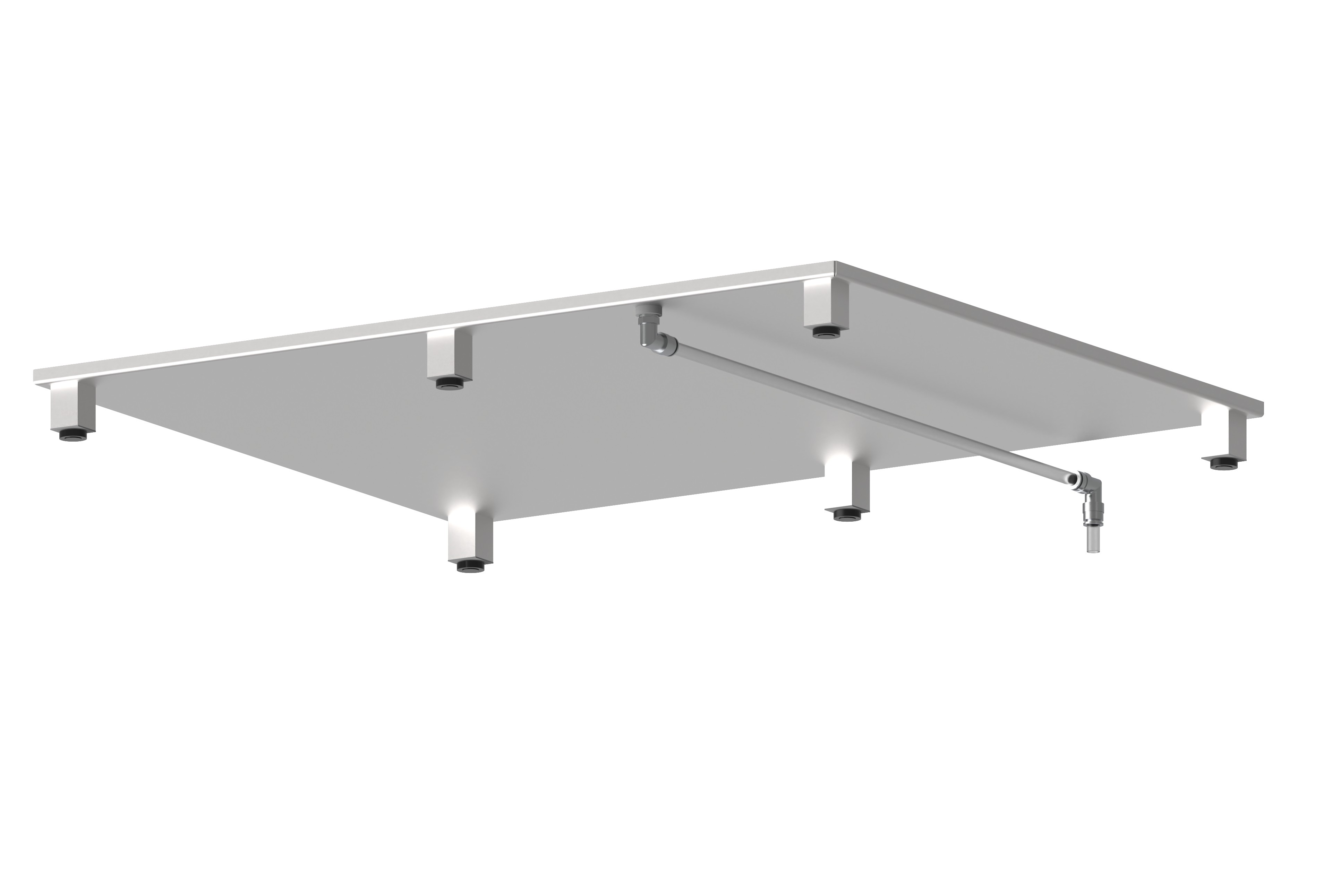 Столешница подставки выполнена в виде приёмного лотка, обеспечивающего сбор пролитой жидкости с дальнейшим сливом через дренажное отверстие. За счёт такой конструкции реализована возможность сбора пролитой воды или иной жидкости с дальнейшим сливом через сливной штуцер в накопительную ёмкость либо канализацию, что значительно упрощает работу с водой и водными растворами.